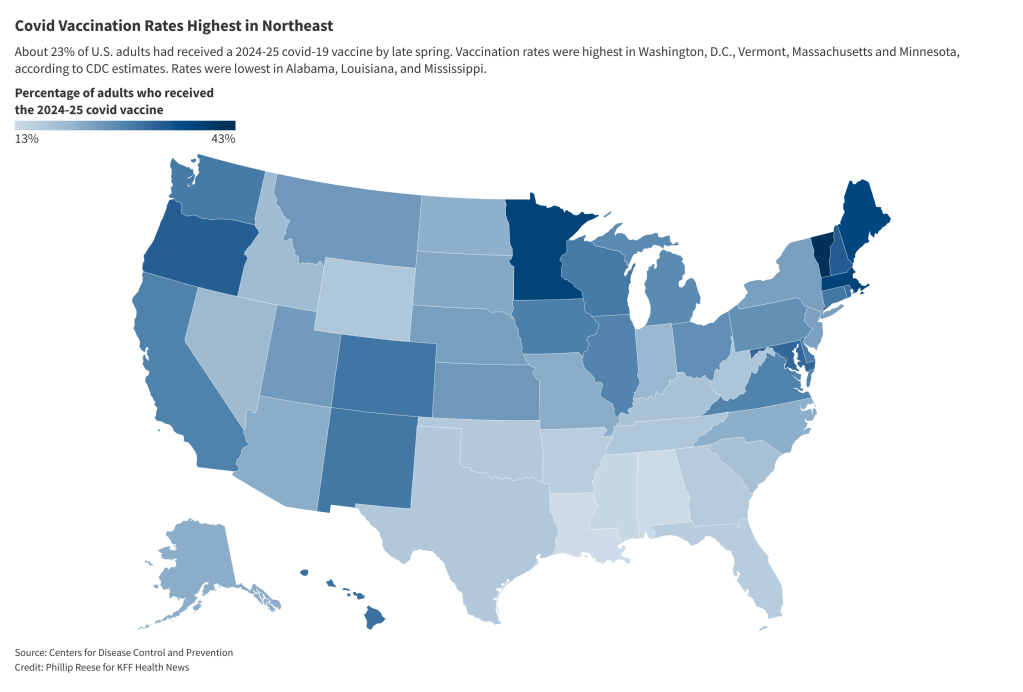 The covid vaccine was initially popular. About 75% of Americans had received at least one dose of the first versions of the vaccine by early 2022, Centers for Disease Control and Prevention data shows. But only about 23% of American adults got a covid shot during the 2024-25 virus season, well below the 47% of American adults who got a flu shot. The vaccination rates for flu, measles, and tetanus are also going down.